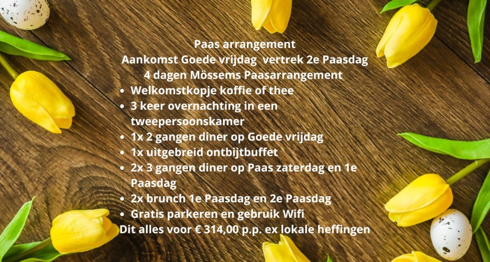 Vier dagen lang genieten van een heerlijk paasarrangement. Met 3x een overnachting, 1x een tweegangendiner + 2x driegangendiner en 2x een brunch op 1e en 2e Paasdag🌞🐣🐥🥚— bij Mössems.