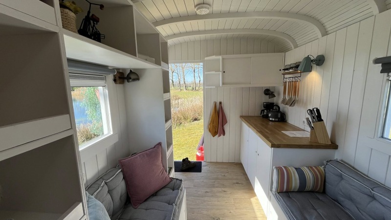 De Pipowagens zijn ingericht voor twee personen. Er is tevens een klein keukentje met koelkastje aanwezig.